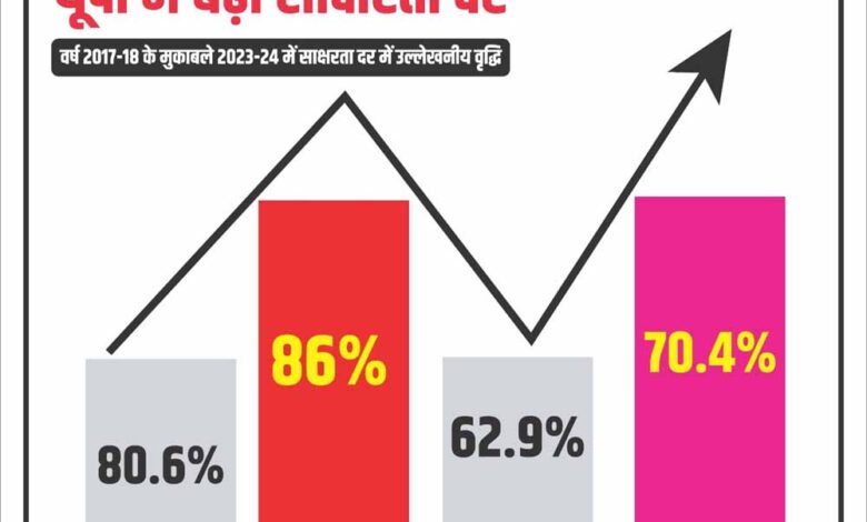 2017-18 से लेकर 2023-24 तक उत्तर प्रदेश में शैक्षिक उपलब्धता, आधारभूत ढांचे, बच्चों के नामांकन, शिक्षा में लोगों की सामुदायिक सहभागिता जैसे क्षेत्रों में उल्लेखनीय प्रगति दर्ज की गई है। साक्षरता दर की बात करें तो जहां 2017-18 में पुरुष साक्षरता दर 80.6% व महिला साक्षरता दर 62.9% थीं, वहीं 2023-24 में यह बढ़कर क्रमश: 86% व 70.4% हो गई है।