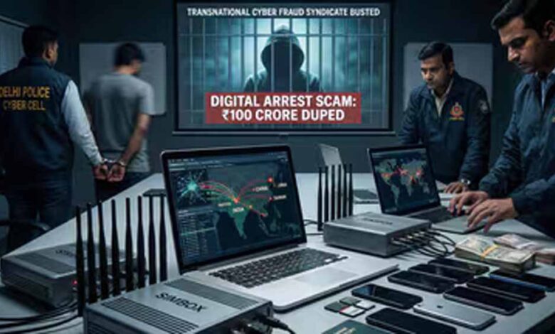 दिल्ली पुलिस ने शनिवार को एक अंतरराष्ट्रीय साइबर ठगी रैकेट का भंडाफोड़ किया है। इसमें हजारों लोगों को कथित तौर पर ‘डिजिटल अरेस्ट’ के नाम पर डरा-धमकाकर लगभग 100 करोड़ रुपये की ठगी की गई। आरोप है कि यह ठगी करने वाला गिरोह खुद को एंटी टेररिस्ट स्क्वाड (ATS) का अधिकारी बताकर लोगों को कॉल करता था और कहता था कि उनके मोबाइल नंबर आतंकवादी गतिविधियों से जुड़े मामलों में इस्तेमाल हुए हैं। इस सिंडिकेट के तार पाकिस्तान समेत कई देशों तक फैले हुए हैं। पुलिस ने अब तक 7 आरोपियों को गिरफ्तार किया है।