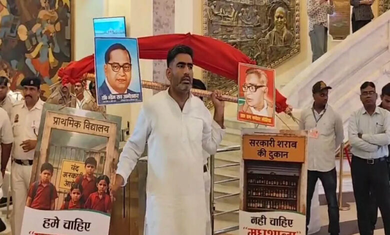 मेरठ की सरधना सीट से समाजवादी पार्टी के विधायक अतुल प्रधान का एक अलग अंदाज देखने को मिला। सपा विधायक आज कांवड़ लेकर विधानसभा परिसर पहुंचे। इस कांवड़ में एक तरफ लिखा था ‘हमें चाहिए पाठशाला’ और दूसरी तरफ था- ‘हमें नहीं चाहिए मधुशाला’। उत्तर प्रदेश में गांवों में बेसिक शिक्षा के स्कूल बच्चों की नींव हैं।